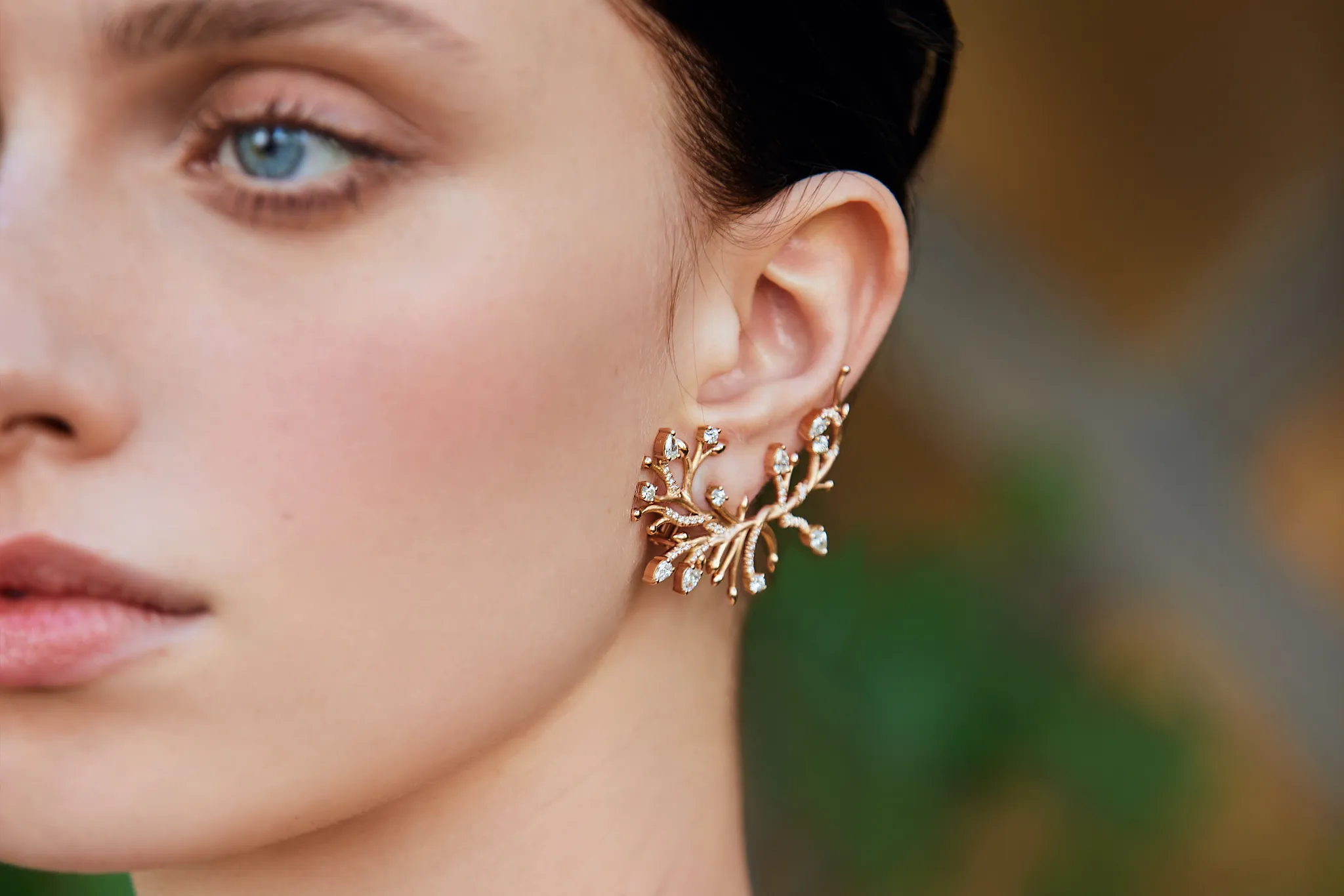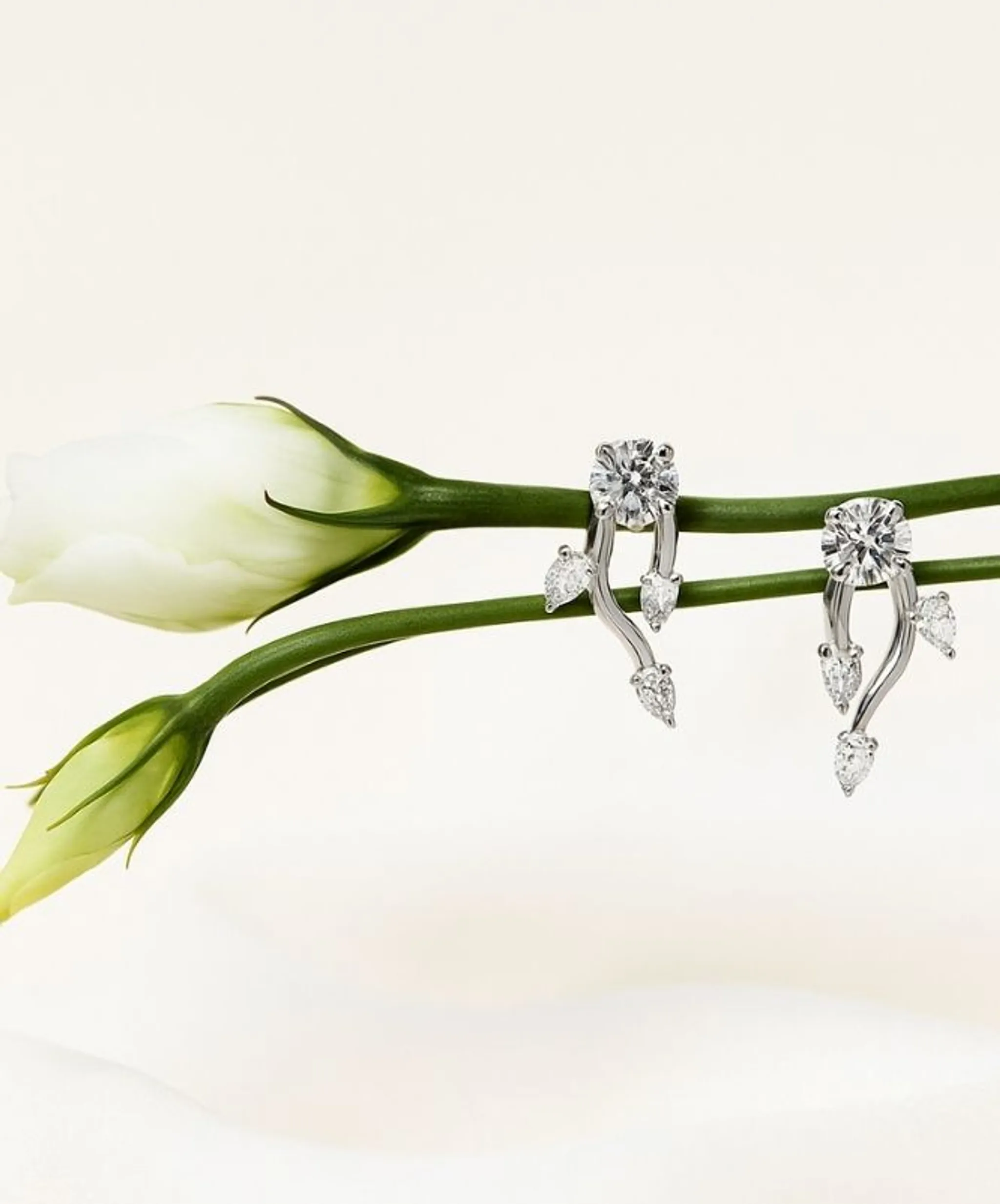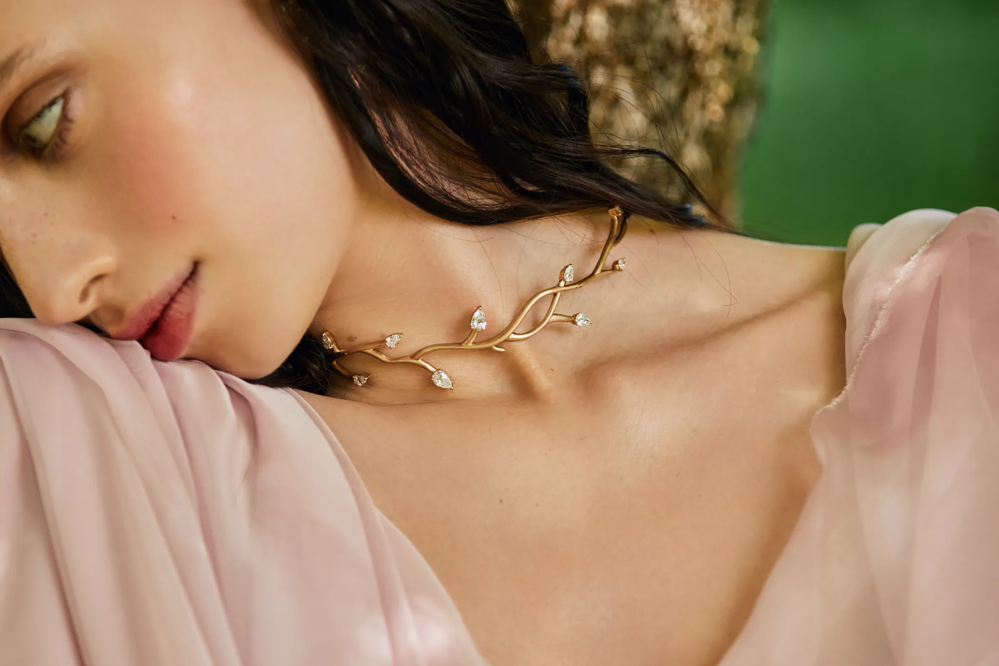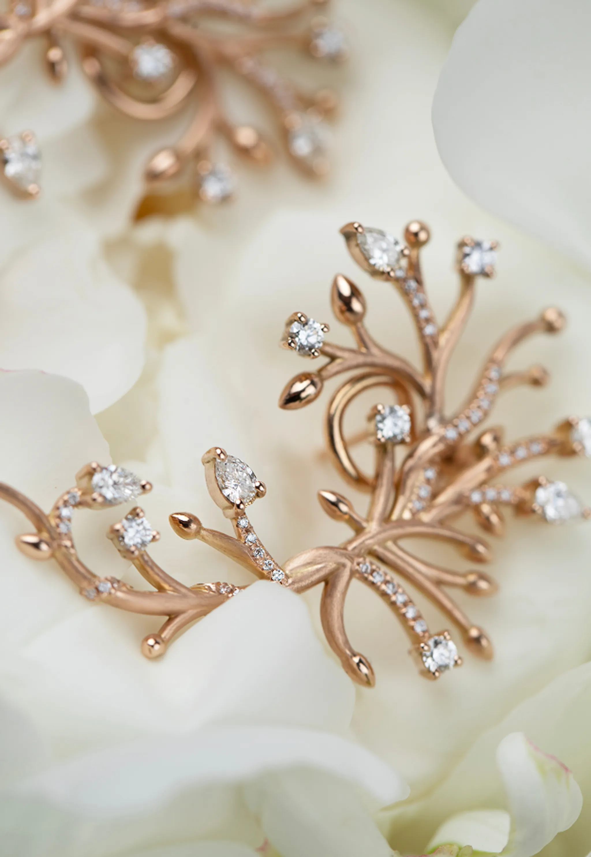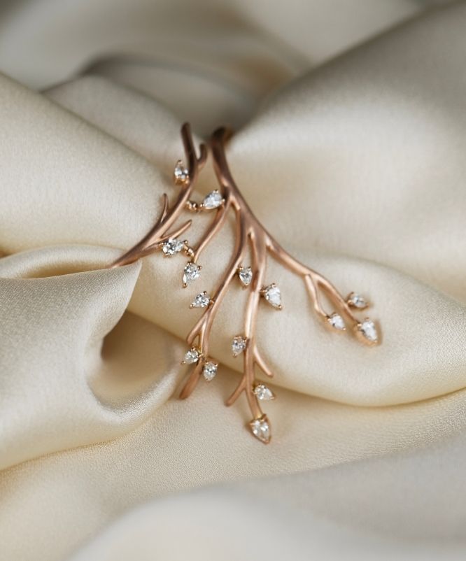 Dai rami un tempo avvolti dal gelo nascono ora steli dorati e foglie di diamante. Le loro forme, scolpite con delicatezza e intenzione, raccontano il passaggio della vita, una transizione armoniosa da una stagione all’altra.